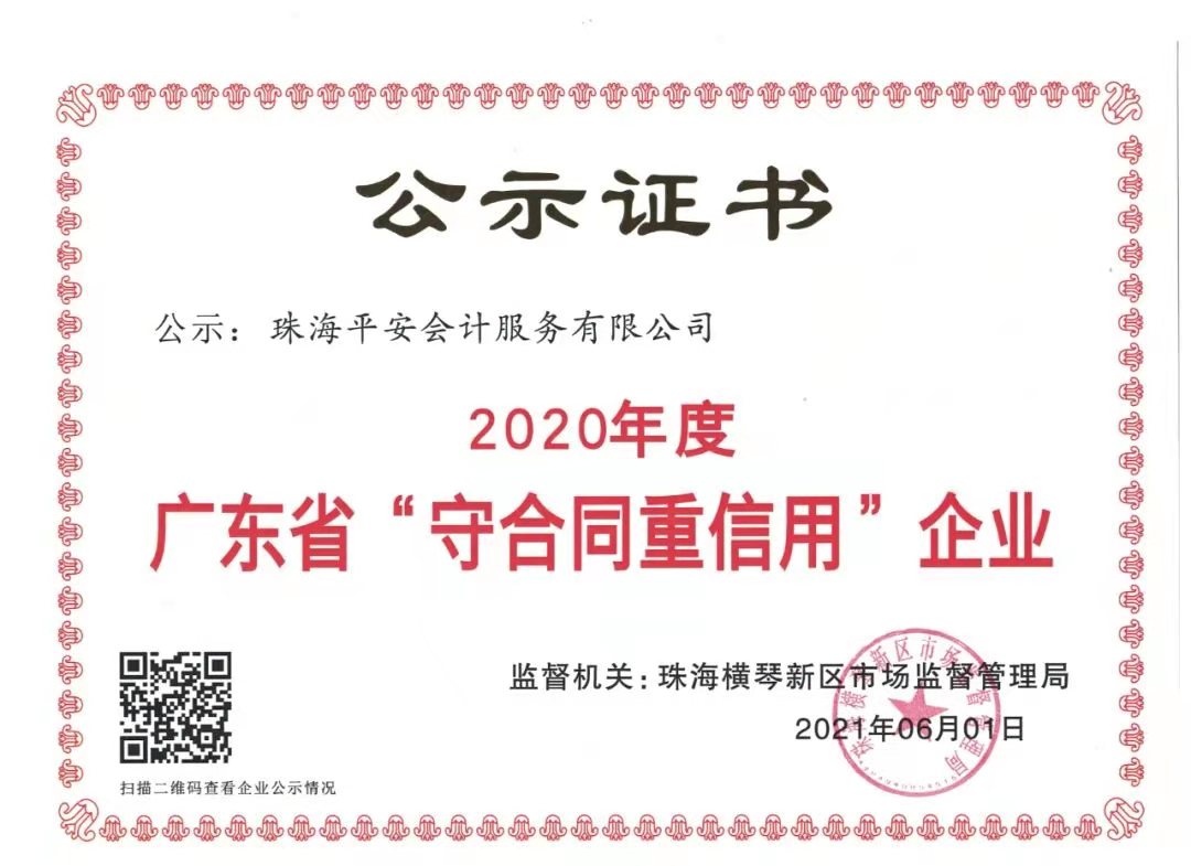 连续四年获得广东省“守合同重信用”可放心委托珠海入户、注册公司等服务
